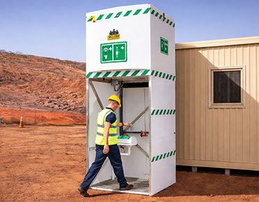 Ideal for mining, chemical handling, manufacturing, agricultural and remote Australian work sites. The self-contained 1500L overhead tank stores a dedicated supply of water, gravity-feeding the shower to deliver a compliant flow rate for the full 15-minute deluge duration, in line with the requirements of AS4775-2007, EN15154 and ANSI Z358.1-2014.